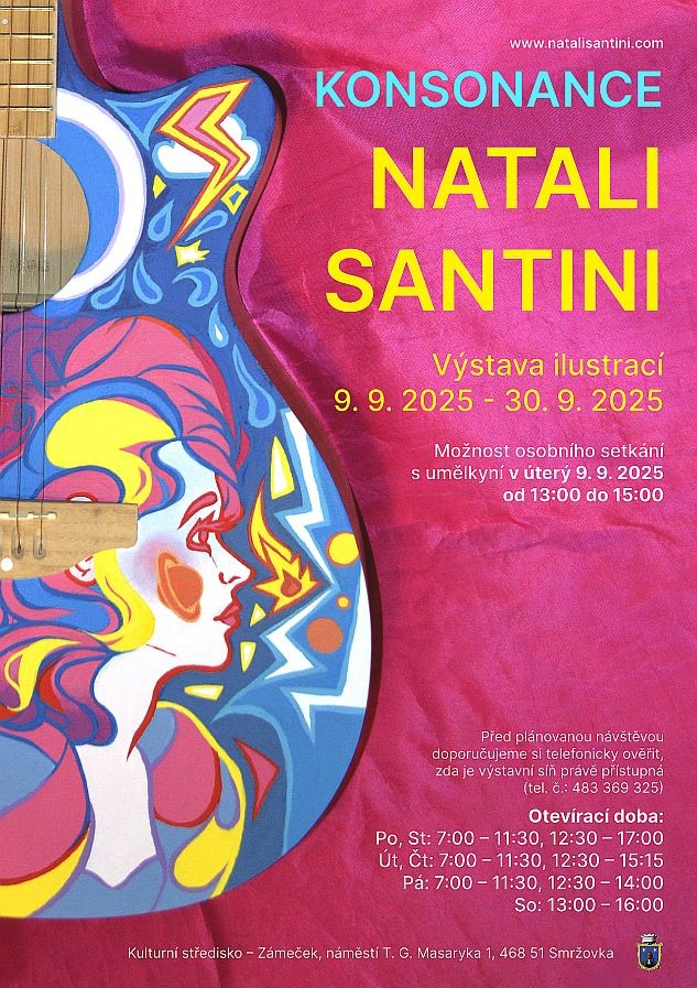 Malířka a ilustrátorka Natali Santini představuje svou nejnovější výstavu s názvem Konsonance, v níž propojuje výtvarné umění s hudbou. Nosným tématem výstavy jsou ilustrace designů akustických kytar. Autorka je známá svým inovativním přístupem a odvahou experimentovat. Její díla jsou elektrizující a plná energie, která doslova přeskakuje na diváky. Její tvorba působí jako vizuální poezie – každé dílo má příběh, náladu a hloubku.